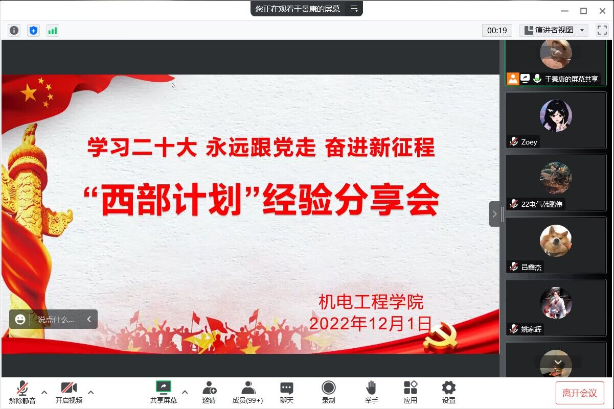 为深入学习宣传贯彻党的二十大精神,号召更多的青年到基层到西部去受教育、长才干、做贡献,beat365唯一官网于12月1日晚七点召开“西部计划”经验分享会。此次活动邀请beat365官网2022届毕业生“西部计划”志愿者梁天赐开展云宣讲,近200名同学参会。
