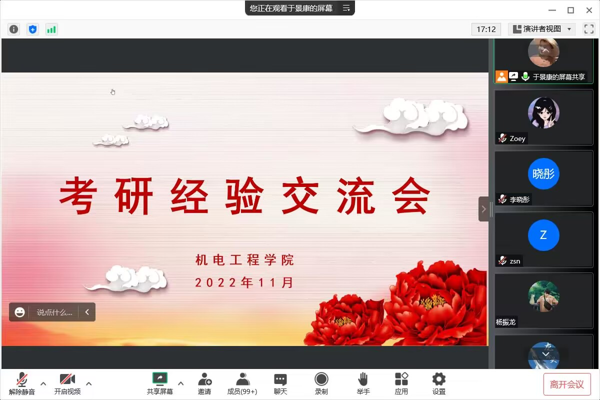 为了进一步加强同学们对研究生考试的认识,了解最新就业形势,做好大学期间的生涯规划,beat365唯一官网于11月18日晚开展考研经验交流会。本次交流会邀请4位考研成功的毕业生现场连线,面向大一、大二本科生展开专题分享。