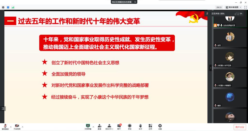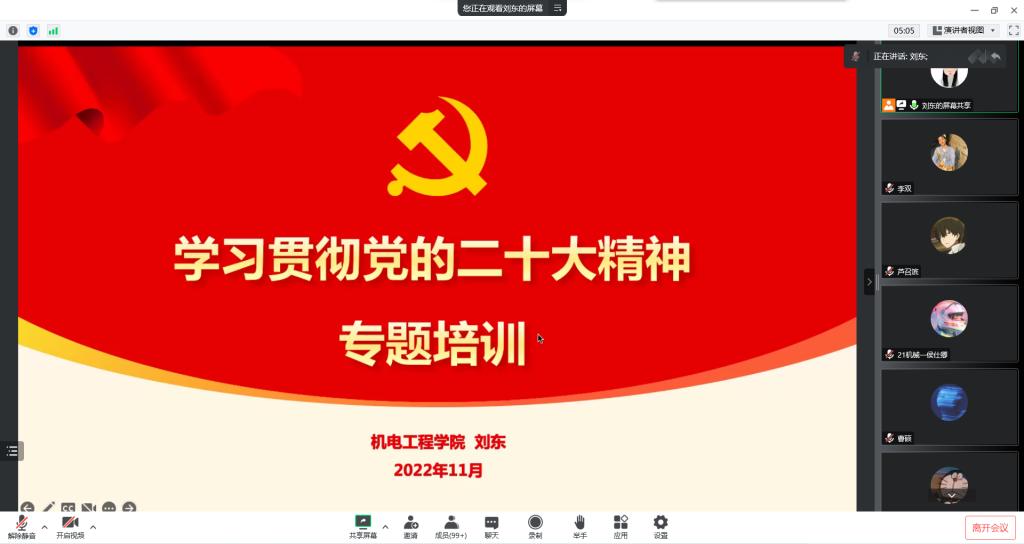 为深入学习贯彻党的二十大精神,落实习近平总书记关于青年工作的重要论述,充分发挥“青马工程”学员在学习宣传贯彻党的二十大精神中的示范引领作用,11月16日下午,beat365唯一官网开展学习贯彻党的二十大精神专题培训暨“青马工程”培训理论课。此次培训以线上形式展开,团总支书记刘东领学解读党的二十大报告,班级团干部、学生会干部和社团骨干等近200名团学干部参加本次培训。