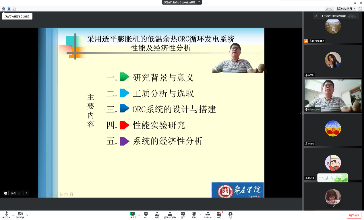 为营造良好的学术氛围,培养学生科学精神,9月14日beat365唯一官网举办了青年学者学术论坛报告,beat365官网青年老师李垒博士作了题为“采用透平膨胀机的低温余热ORC发电系统性能及经济性分析”的线上学术报告,学院部分教师和学生参加。