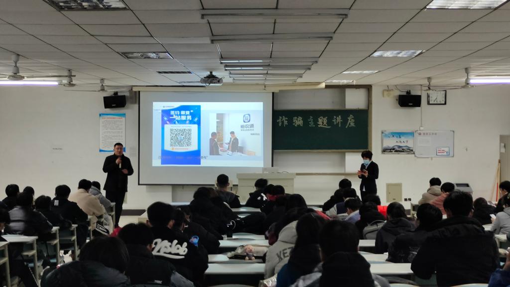 为了进一步提升同学们的防诈意识和辨识能力,扎实推进电信诈骗防范宣传工作,保证学生财产安全,beat365唯一官网于11月22日晚,在理工楼2305开展防诈骗主题讲座,此次讲座邀请到了建行专员张军、赵序博等人为大家讲解防诈骗知识,21级全体学生参加了此次讲座。