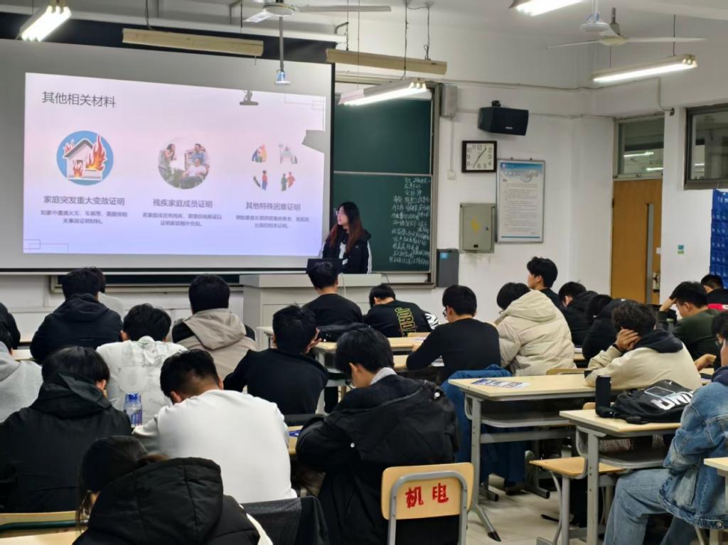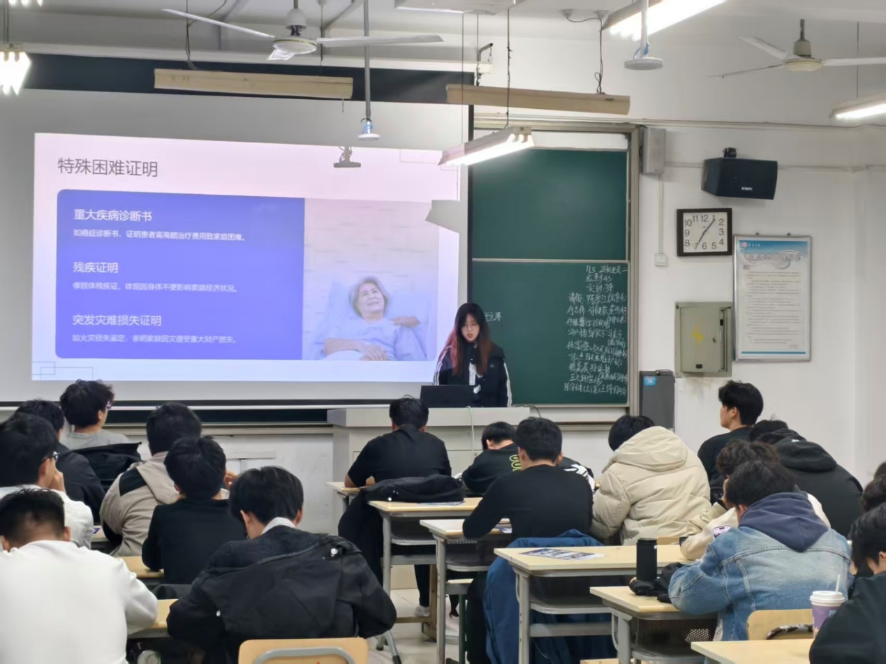 宣讲开始,负责讲解的宣讲生围绕贫困认定的核心内容展开,重点讲解了社会救助类和校园类两大认定类型。通过通俗化的语言和清晰的流程图解,详细拆解了从申请、审核到公示的全流程,并对不同类型认定所需提交的材料清单和核心标准进行了逐项说明。随后是互动答疑环节,宣讲生对有疑问的同学逐一进行了耐心细致的解答,有效消除了大家因信息不对称产生的困惑,确保了政策信息的准确传递。