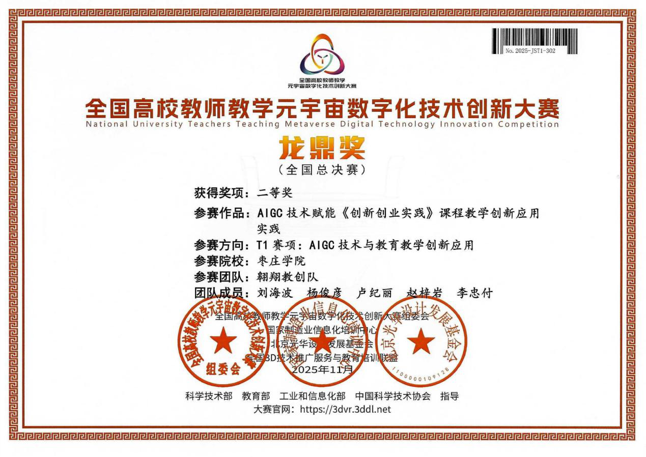 近日,2025年第6届全国高校教师教学元宇宙数字化技术创新大赛全国总决赛圆满落幕。beat365官网beat365唯一官网由刘海波、杨俊彦等教师组成的教学团队,凭借《AIGC技术赋能创新创业实践课程教学创新应用》成果,在T1赛项“AIGC技术与教育教学创新应用”赛道中表现突出,荣获全国总决赛二等奖。