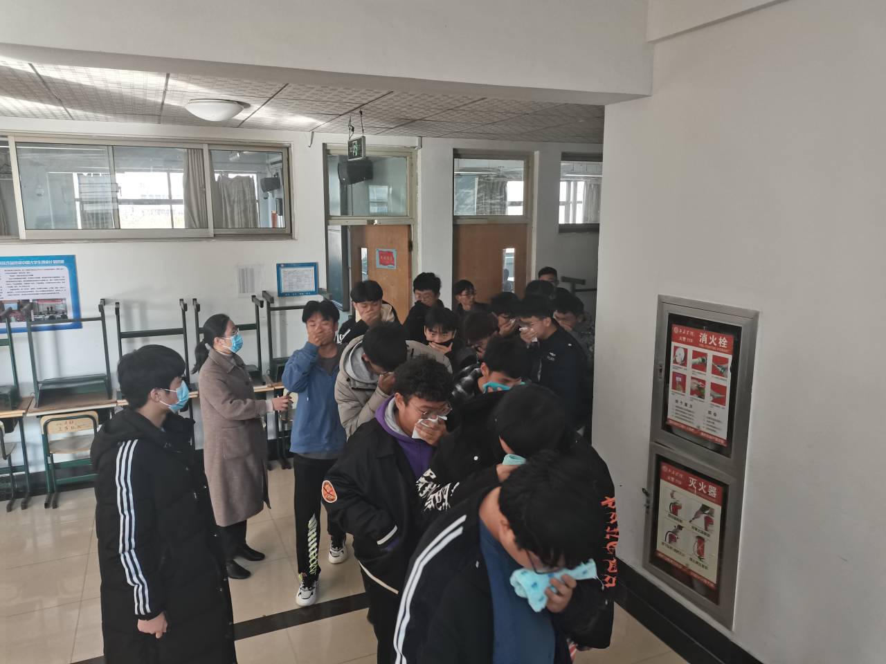 15时,随着刺耳的消防警报,理工教学楼四楼“烟雾弥漫”,面对突如其来的“火”警,全体师生按照消防演练预案迅速行动,各楼层安全员及相关组织人员立即到达指定岗位,做好疏散准备。各班学生在辅导员的带领下,按照疏散线路有序撤离,大家用湿毛巾(湿手帕)捂住口鼻、弯腰、低姿、小碎步,动作规范、迅速地向指定地点集合,各班清点并上报人数,顺利完成疏散演练。