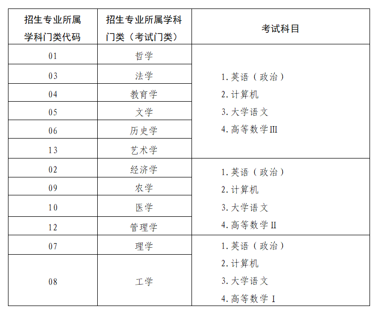 说明:考试门类依据教育部《普通高等学校本科专业目录(2020年版)》划分;高职本科招生专业对应考试科目参照本表执行。