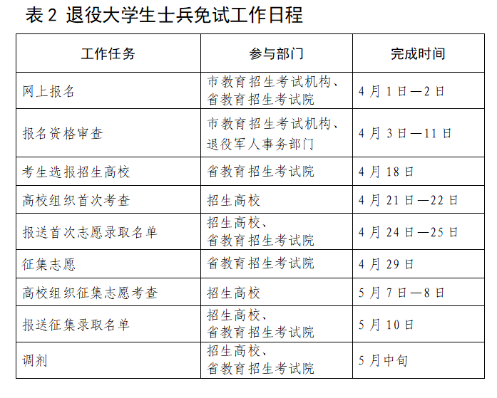 1.退役大学生士兵考生报名资格审核由市级教育招生考试机构和退役军人事务部门共同负责。退役军人事务部门审核考生退役士兵资格及立功受奖情况,市级教育招生考试机构审核考生报考资格,于2025年4月11日前通过管理平台提交审核结果。