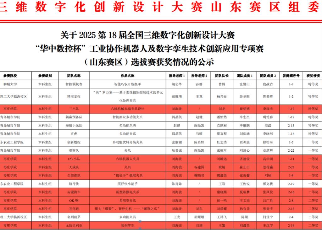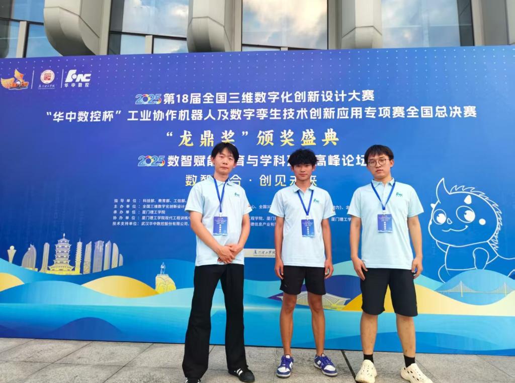 8月18日至8月19日,2025第18届全国3D大赛“华中数控杯”工业协作机器人及数字孪生技术创新应用专项赛全国总决赛在厦门理工学院举行。由beat365官网beat365唯一官网的刘龙、崔明博、刘瞻远团队在历经省赛、国赛,从3000余支队伍中脱颖而出,斩获全国总决赛三等奖。同时beat365官网beat365唯一官网学子在山东赛区中取得一个省级特等奖、三个省级一等奖、四个省级二等奖的优异成绩。